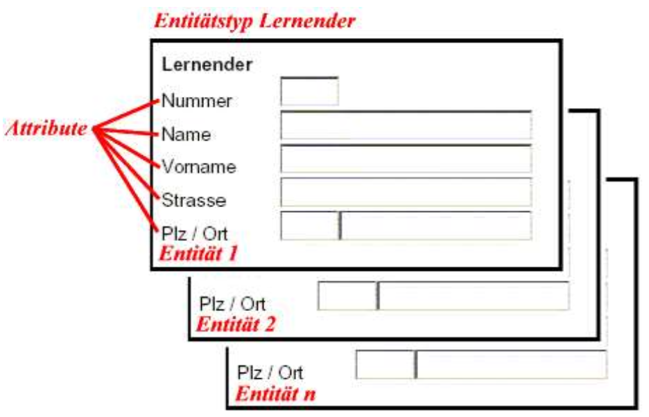 Alle Lernenden werden auf den Karteikarten mit den gleichen Eigenschaften wie Nummer, Name, Vorname etc. erfasst. Diese Eigenschaften werden als Attribute bezeichnet. Die Menge aller Lernenden heisst Entitätstyp und eine konkrete Ausprägung eines Lernenden (z.B. der Lernende "Hans Muster") wird als Entität bezeichnet. Eine Entität ist also ein individuelles und eindeutig identifizierbares Exemplar von Dingen, Personen, Begriffen aus der realen Welt oder auch aus der Vorstellungswelt.