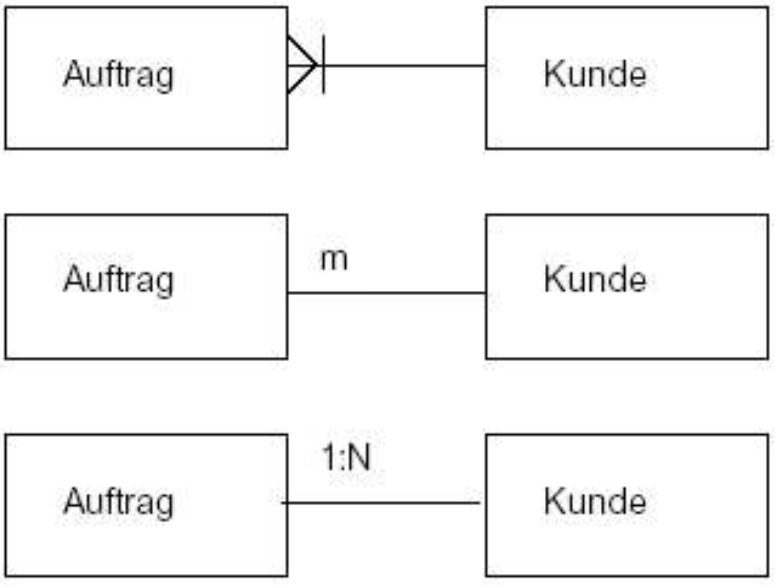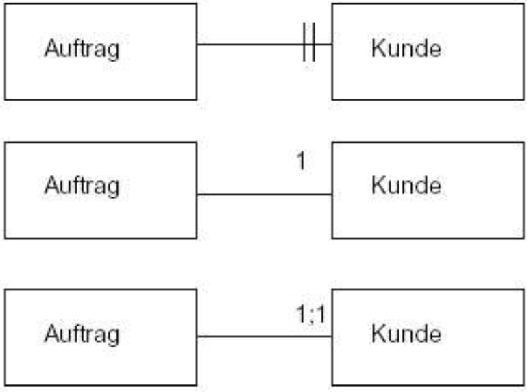 Für die Angabe der Kardinalitäten werden in der Praxis verschiedene Notationen verwendet. Folgende Darstellungen sind neben weiteren gebräuchlich: