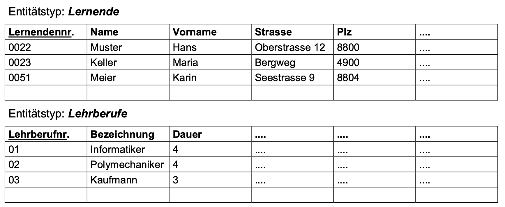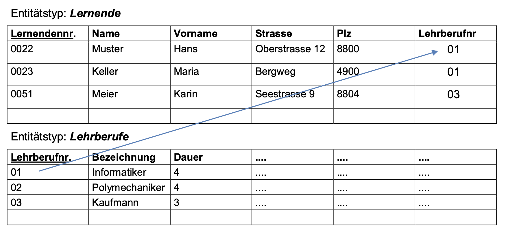 Um Daten möglichst redundanzfrei zu speichern, besteht ein Modell im Normalfall aus mehreren Entitätsmengen resp. Tabellen. Am Beispiel oben kann so verhindert werden, dass die Information bezüglich eines Lehrberufes bei Lernenden mit dem gleichen Lehrberuf in der Tabelle Lernende mehrfach und wiederholt gespeichert wird. Diese Tabellen existieren zunächst unabhängig voneinander.